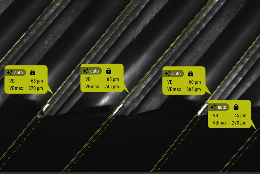 La cámara VT 122 junto con la nueva versión 1.6 del software Visual Tool Check ofrecen una medición del desgaste basada en la inteligencia artificial que automatiza por completo los procesos que antes requerían intervención manual. La rápida documentación del proceso queda integrada a la perfección en los procesos de mecanizado y supone una ventaja decisiva no solo para los sectores aeroespacial y médico. El usuario controla totalmente la medición del desgaste basada en la IA de manera muy sencilla a través de los ciclos del VTC. El control numérico aproxima la herramienta frente a la cámara con el cabezal girando lentamente. De este modo, se obtiene una imagen panorámica de todas las cuchillas de la herramienta. A partir de esta imagen, el software Visual Tool Check 1.6 determina de forma totalmente automática el desgaste de las caras destalonadas.